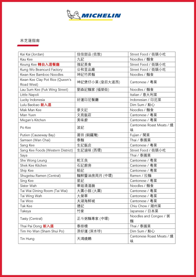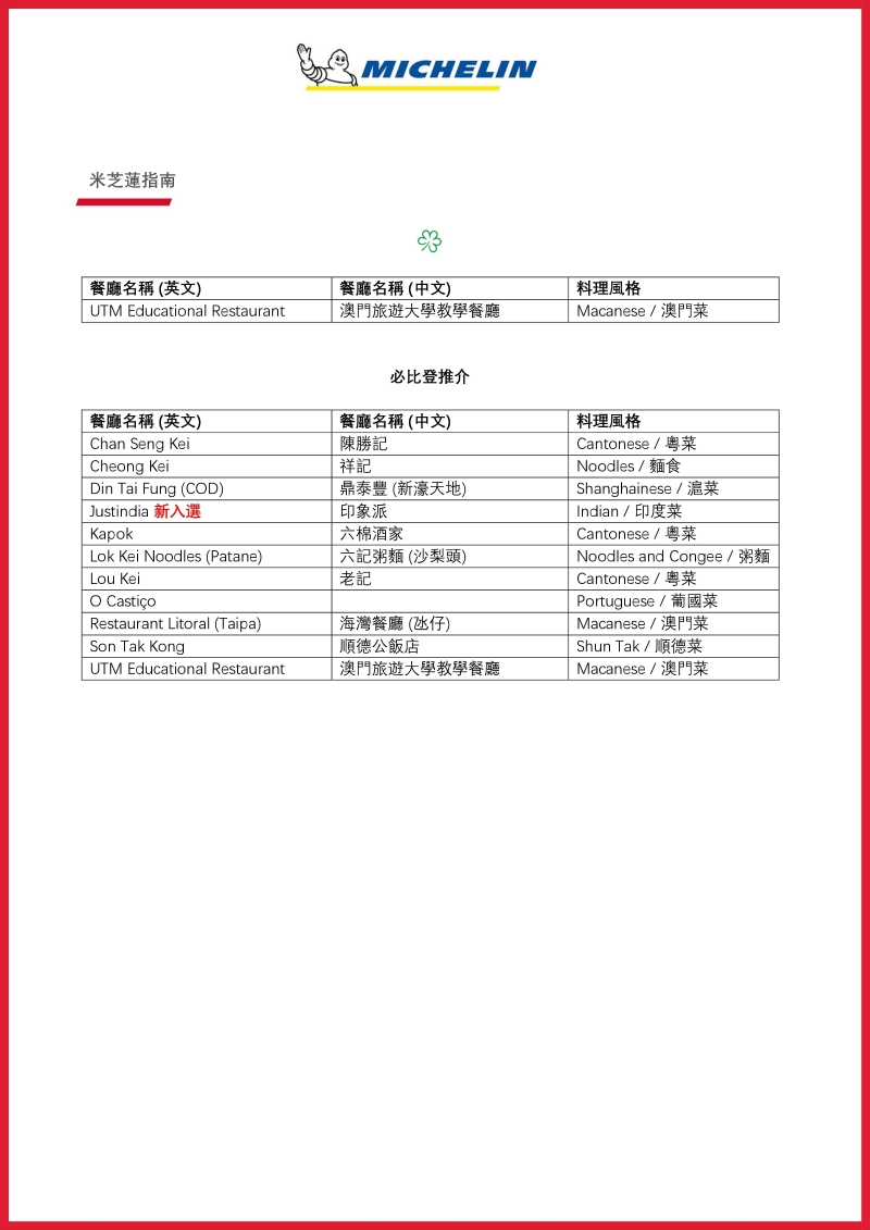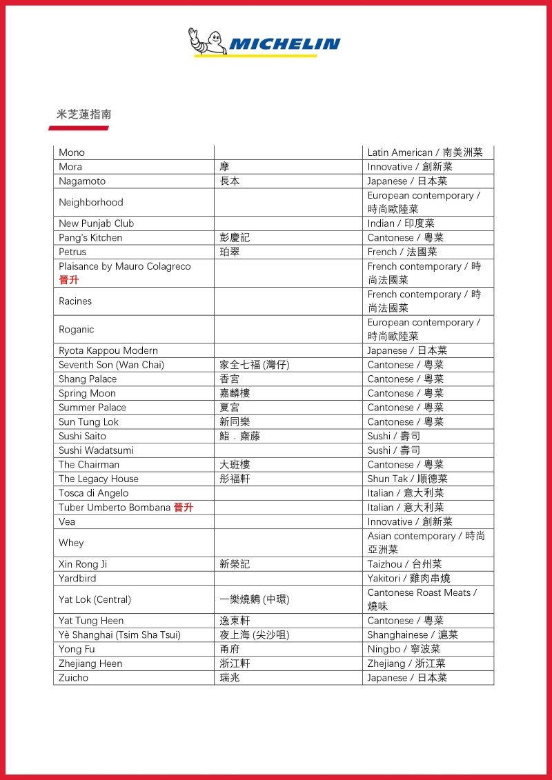 連同上述餐廳,《香港澳門米其林指南》現有共9間米芝蓮三星餐廳,當中包括7間香港餐廳及2間澳門餐廳。