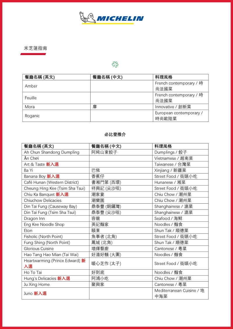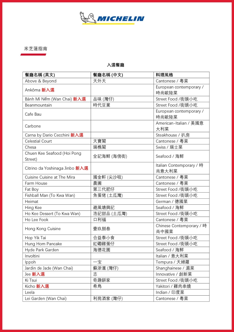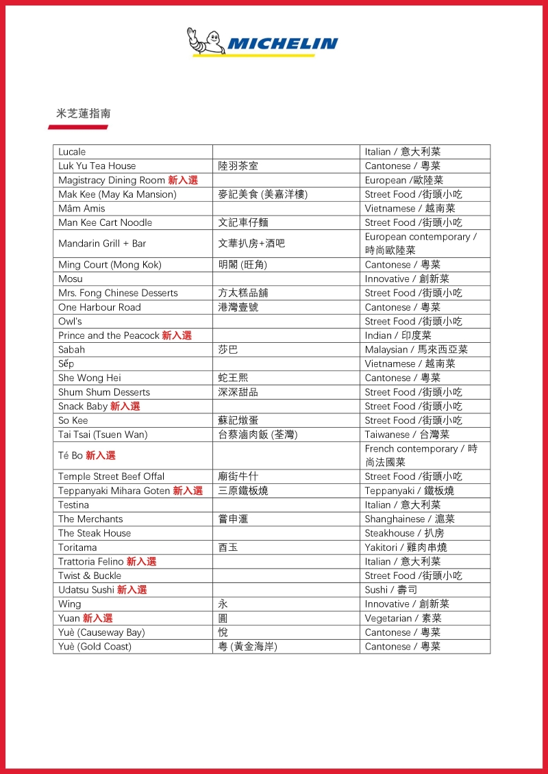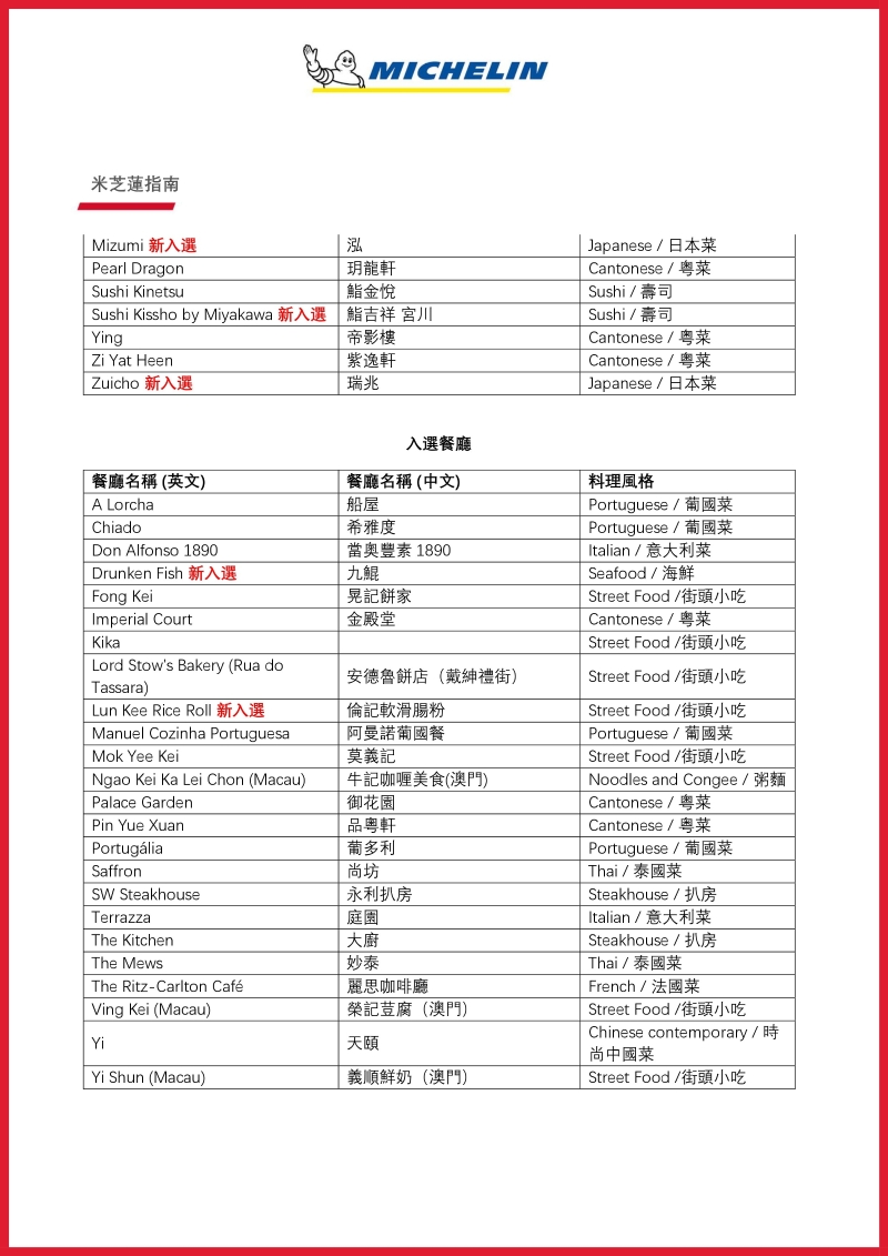 米芝蓮香港澳門新上榜一星餐廳: