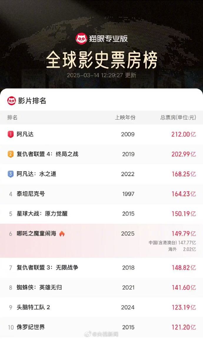 香港新聞網3月14日電 據網絡平台數據,《哪吒之魔童鬧海》(《哪吒2》)海外票房突破2億元(人民幣,下同)。截至目前,全球票房(含預售及海外)已超149.79億元,位居全球影史票房榜第6,距前一名的《星球大戰:原力覺醒》(總票房150.19億元)僅差0.4億。