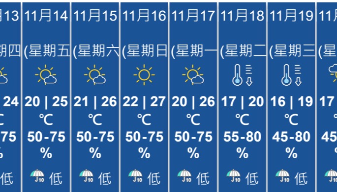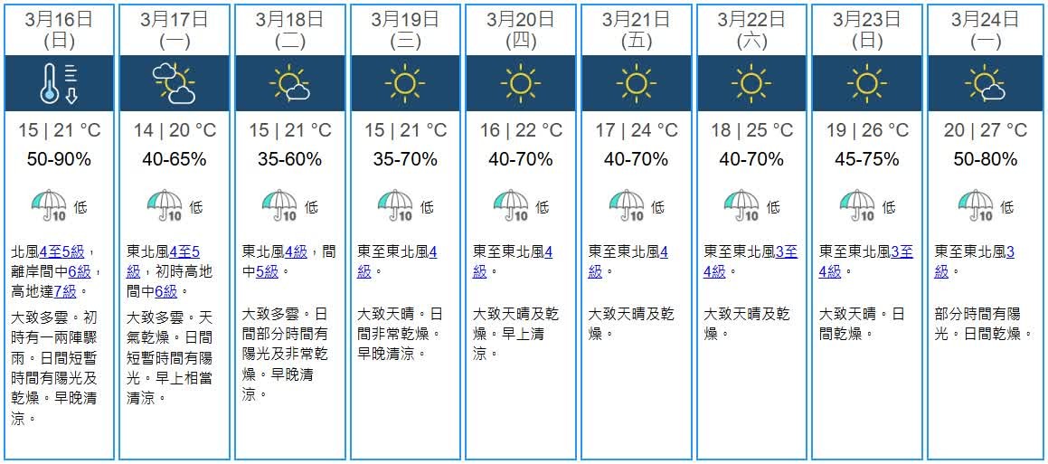香港地區未來9日天氣預報。香港天文台截圖 天文台指出,未來兩三日清晨氣溫較低,最低氣溫約在14℃-15℃之間,日間偶有陽光。明日(16日)風勢較大,下周中後期則大致天晴,天氣乾燥。 此外,天文台預測今日(15日)天氣大致多雲,局部地區可能出現驟雨。下午時段或有短暫陽光,但沿岸地區能見度較低,晚間局部地區可能出現雷暴。風向為和緩東風,北風逐漸增強,今晚氣溫將明顯下降。(完)