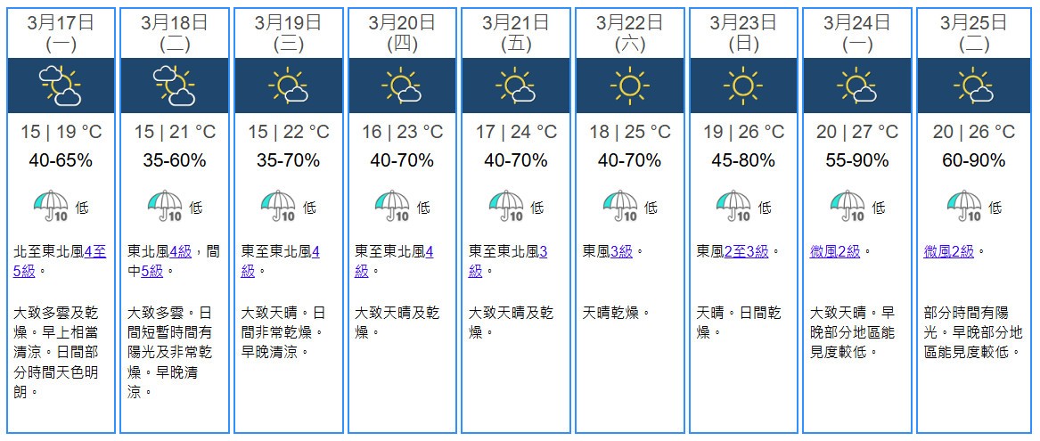 香港3月17日早晨各地區最低氣溫。香港天文台截圖 香港地區今日天氣預測:大致多雲及乾燥。早上相當清涼。日間部分時間天色明朗,最高氣溫約19度。吹和緩至清勁北至東北風。