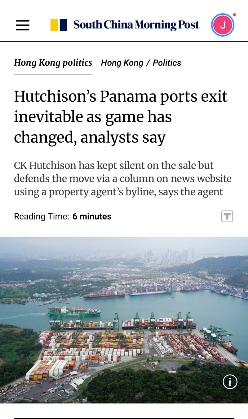 香港新聞網3月25日電 香港企業長江和記實業早前計劃出售巴拿馬運河港口等資產,引發社會廣泛討論。據《南華早報》25日報道,香港本地房地產代理公司Dorbo Realty的董事總經理Rickey Chan Chi-po告訴該報,長江和記實業內部的一名聯繫人要求他於3月12日發表一篇專欄文章,為該公司出售港口的理由辯護。
