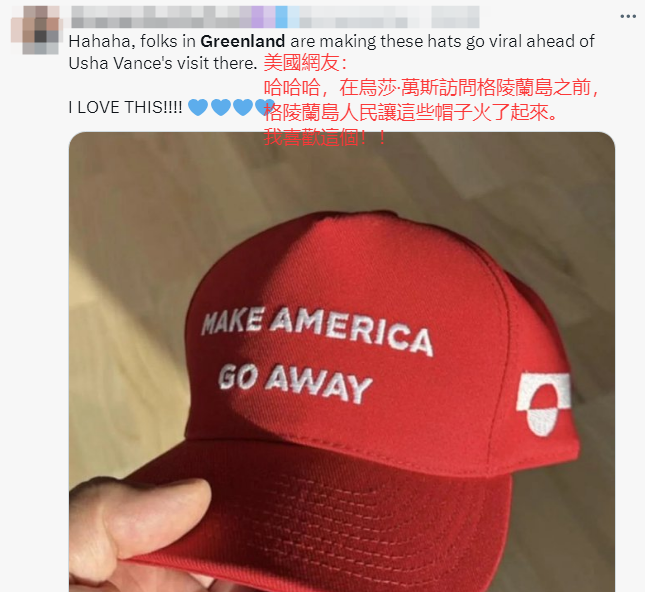 格陵蘭島的創作者在社交平台上發佈的“讓美國滾開”的帽子(社交平台截圖) 據了解,特朗普此前曾屢次表達奪取格陵蘭島控制權的強烈意願,還稱不會排除通過“軍事或經濟脅迫”手段奪取該島控制權的可能性。此事引發格陵蘭島人民的不滿,今年1月份的一項民意調查顯示,85%的格陵蘭人表示不想成為美國的一部分。24日,丹麥外交部長拉斯穆森就烏莎·萬斯率代表團訪問格陵蘭島一事批評說,這一舉動反映出“美國人不恰當的欲望”。 因此,美國新聞周刊 (Newsweek)24日報道稱,這款“讓美國滾開”帽子具有反“讓美國再次偉大”意義,帽子的設計者約翰森認為,烏莎·萬斯的來訪是一場“魅力攻勢”,他希望格陵蘭人民表明,他們不希望美國接管他們的國家。 印度經濟時報(The Economic Times)也注意到這頂帽子,26日報道稱,該帽子象征著當地民眾對美國領土野心的抵制,意在批評特朗普收購礦產資源豐富的格陵蘭島的提議,并形容“‘讓美國走開’帽子正病毒式傳播”。 目前,該款帽子正在社交平台上引起熱烈討論,相關帖子已獲得了超過2.7萬點讚。 來自世界各地的網友也正積極地在網絡分享這款新帽子,“這是格陵蘭島特色的‘MAGA’帽子”“太棒了!我在哪裡可以買到這樣的帽子?盡量多寄幾頂到愛爾蘭,我們會很高興戴上它們!”,甚至連美國網友自己也表示支持:“格陵蘭島人民讓這些帽子火了起來。我喜歡這個!”