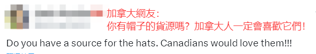 評論區中,呼聲最高的還是加拿大網友,“我也想要一頂這樣的帽子”“我想知道他們是否運送到加拿大”“你有帽子的貨源嗎?加拿大人一定會喜歡它們!”