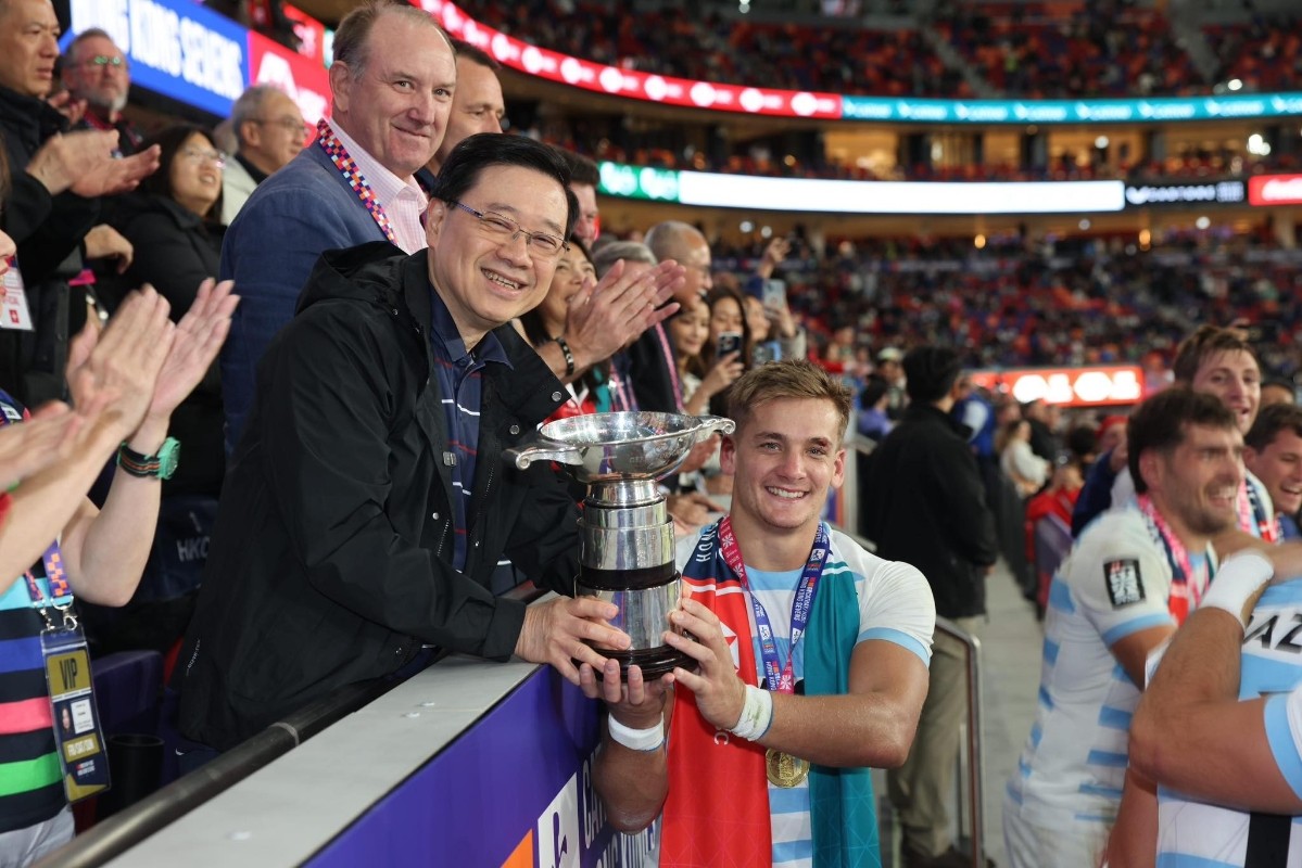 國泰航空A350客機飛越維港,低飛到啟德體育園上空附近。(香港中通社記者洪少葵攝) 香港特區行政長官李家超亦到場觀賽。他形容,場館上蓋打開,天氣雖涼卻無阻高漲熱情;燈光效果、音響設備、充滿活力的佈置一應俱全,球迷的喝彩聲響徹場館,讓這項香港盛事煥然一新。 李家超亦置身其中,和球迷一同喝啤酒、享受賽事,並與男女港隊球員聊天,祝賀他們分別在銀劍賽中奪冠。他表示,香港七欖已是本地旗艦盛事之一,推動香港成為國際體育盛事之都;啟德體育園主場館首場大賽已圓滿“達陣”,作為香港的新主場,期待未來的盛事精彩不斷。