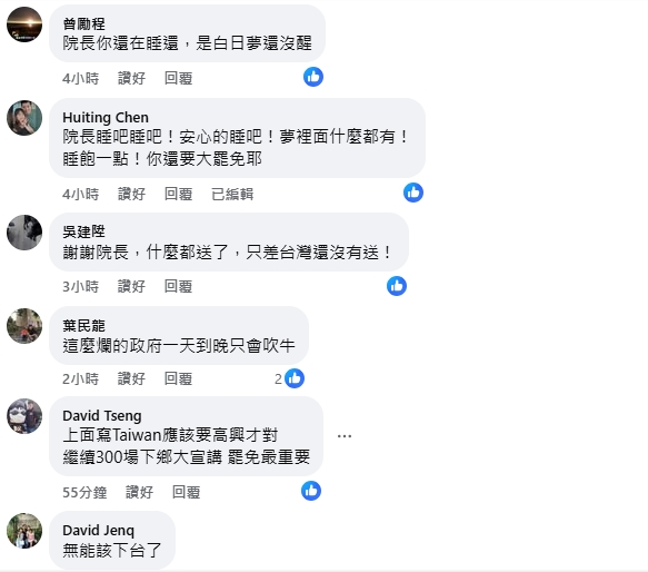 消息傳出後,憤怒的台灣網友紛紛湧入卓榮泰的臉書評論區,展開激烈炮轟。有網友指責民進黨只會說空話、搞罷免,該做的事卻一件不做,“32%關稅看你們這群愛扯謊的團隊又要怎麼去愚弄民眾!”還有網友表示:“真的太爛了,太厲害了。由衷佩服,沒想到10年綠黨能把台灣搞成這副模樣。”還有不少網友要求卓榮泰下台,類似的負面評論更是鋪天蓋地。
