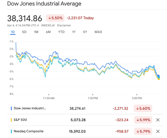 香港新聞網4月5日電 儘管美國的非農數據表明美國就業強勁,但由於特朗普發起的周五全球關稅戰升級,鮑威爾講話并未救市,美股連續第二日暴跌收官,由此創疫情高峰以來最大單周跌幅,納指跌入技術性熊市。商品連日重挫,避險風潮推動美債暴漲,周四遭拋售的美元反彈。 截至今天凌晨美股收盤數據,道瓊斯工業平均指數下跌5.5%,標普500指數下跌5.97%,納斯達克綜合指數下跌5.82%,標普和納指雙雙創下2020年3月疫情以來最大單日跌幅,標普在特朗普宣布關稅措施後,兩天下跌10%,在4日當天盤中一度即將觸及7%的盤中熔斷跌幅的危險位置,本周標普累計下跌9.1%,創下2020年3月疫情期間最差單周表現,納斯達克指數正式進入技術性熊市區間。