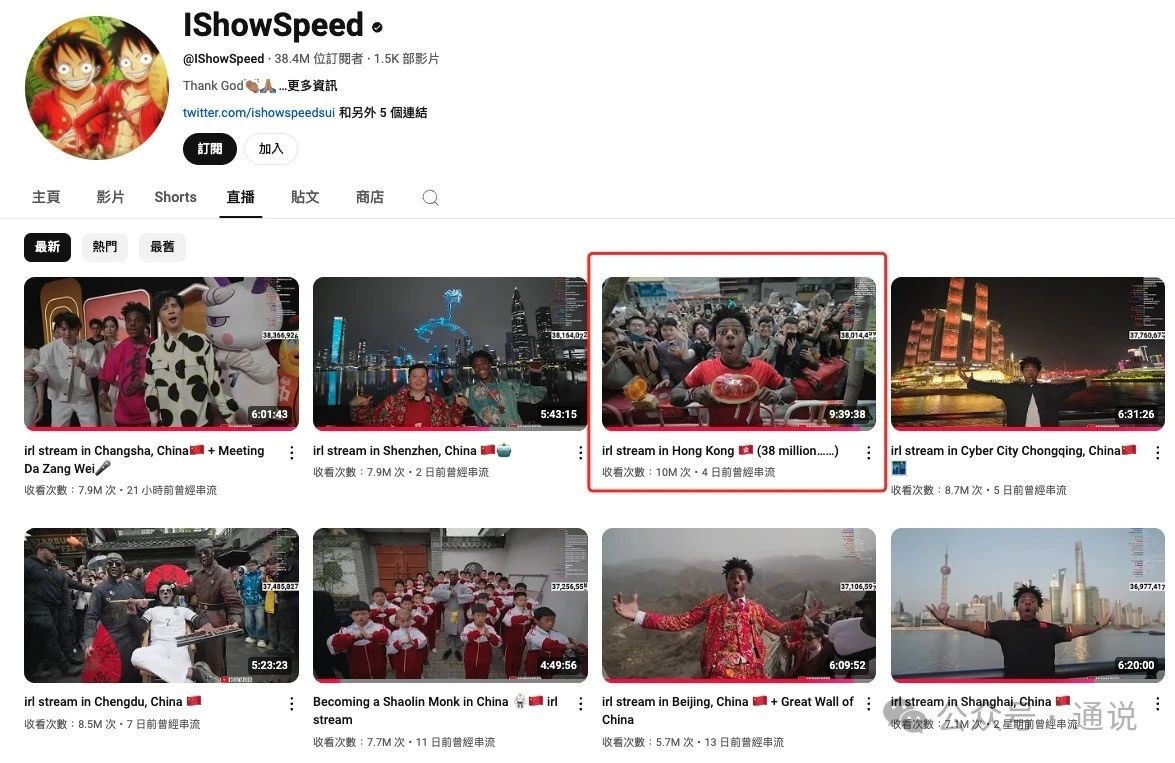 上周,在YouTube擁有千萬粉絲的美國網紅“甲亢哥”(IShowSpeed)在中國多個城市游玩直播吸引眾多關注。儘管有不少網友吐槽其在香港的行程安排不够“有看點”,但“香港行”的這一場直播,是“甲亢哥”今次中國行8場直播中最受關注、唯一一個在YouTube破千萬播放量的直播,足見香港的魅力。
