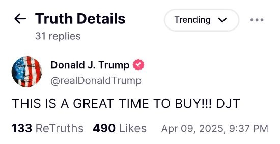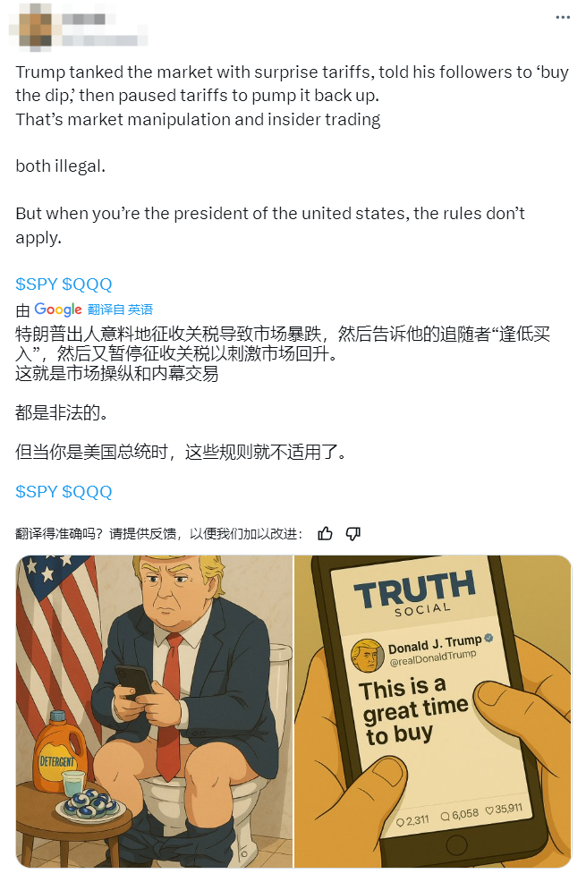 美國總統特朗普周三(9日)在社交平台表示,現在是購買特朗普傳媒與科技集團(Trump Media & Technology Group Corp.,DJT)的好時機。(社交平台截圖,但該帖文現已删除) 截止當天收盤,美股三大指數收盤集體大漲,納指漲12.16%,為2001年1月3日以來最大單日百分比漲幅;標普500指數漲9.52%,錄得2008年10月28日以來最大單日百分比漲幅;道指上漲近3000點,漲幅7.87%。 此前因特朗普拋出的所謂“對等關稅”,美國市場經歷了動蕩的一周。僅僅4月3日、4日兩個交易日,美國股市就蒸發了約6.6萬億美元的市值,是有史以來最大紀錄。 9日晚間,美國商務部長霍華德·盧特尼克在接受採訪時被問及特朗普這些帖子時,解釋道:“特朗普可能只是在敦促人們趁價格相對較低時入市。” 美國全國廣播公司新聞部報道指出,雖然沒有實際證據表明特朗普試圖操縱市場,但美國前總統小布什的首席道德律師理查德·佩恩特(Richard Painter)表示:“這種情況(指特朗普發的帖子)可能會讓總統面臨參與市場操縱的指控。” 事實也是如此,許多網友已經提出特朗普市場操縱的質疑。社交平台上流行著一個新詞——“特朗普暴漲(Trump Pump)”,來諷刺此次美股漲勢。 其中一位網友諷刺道:“特朗普突然加征關稅引發市場暴跌,鼓動支持者逢低買入,隨後暫停關稅助推市場反彈。這種操作同時構成了市場操縱和內幕交易——兩項都是違法行為。但若身為美國總統,規則對你根本無效。”