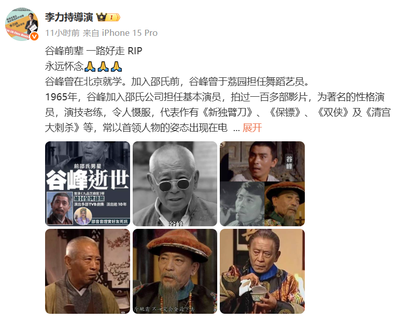圖片來源:李力持導演微博 谷峰,本名陳思文,1930年7月3日出生於上海。他早年曾在北京就學,加入邵氏電影公司前,在荔園擔任舞蹈藝員。1965年,谷峰正式加入邵氏公司擔任基本演員,自此開啟了輝煌的演藝生涯。在邵氏期間,他參演了一百多部影片,憑藉精湛的演技成為著名的性格演員,以老練的演技和令人懾服的氣場,常以首領人物的姿態活躍於電影銀幕,代表作有《新獨臂刀》《保鏢》《雙俠》及《清宮大刺殺》等。 谷峰在演藝事業上成就斐然,曾兩度斬獲台灣金馬獎最佳男配角獎。1972年,他憑藉《武鬆》一片獲第19屆台灣金馬獎最佳男配角獎;一年後,又憑藉《待罪的女孩》成功衛冕該獎項。 1977年開始,谷峰多次在金庸武俠片中出演重要配角,給觀眾留下了深刻印象。在1977年《射雕英雄傳》和1978年《射雕英雄傳續集》中,他飾演的丐幫幫主洪七公形象深入人心。此外,他在其他經典作品中的表現同樣可圈可點。1994年,與周星馳合作《九品芝麻官》,在劇中飾演常威之父水師提督常昆;1998年,在陳小春版《鹿鼎記》中飾演海大富海公公;2006年,在成龍電影《寶貝計劃》中飾演人字拖的父親。 踏入1990年代,谷峰逐漸將工作重心轉向電視劇集。2011年後,他宣告淡出演藝圈。 谷峰的演藝生涯跨越數十年,塑造了眾多經典角色,他的離去讓無數影迷感到惋惜。有網友感慨:“香港演員就算是配角,也都能記得清清楚楚,主要是他們演技好,很敬業,不像是現在的劇,我能記住幾張臉就不錯了。”“一代人又一代人的青春落幕了。” (完) 【編輯:紀東】