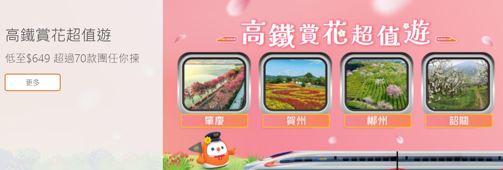 香港高速鐵路MTR網站首頁,亦出現“高鐵賞花超值遊”推廣內容。(網站截圖)