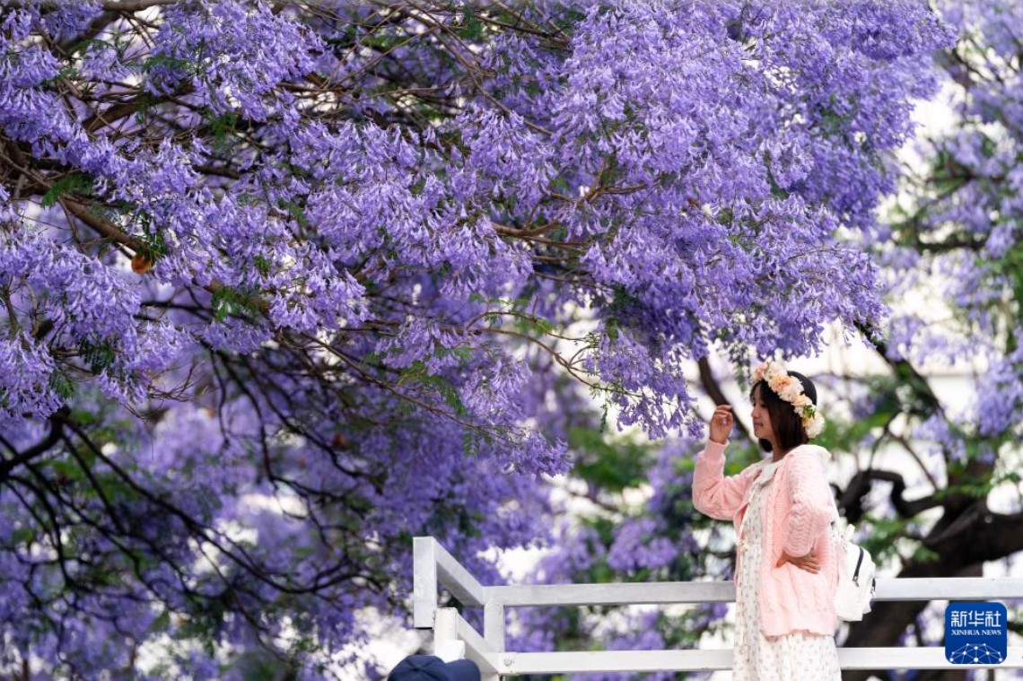 遊客在雲南省昆明市教場中路與藍花楹合影。(新華社資料圖)