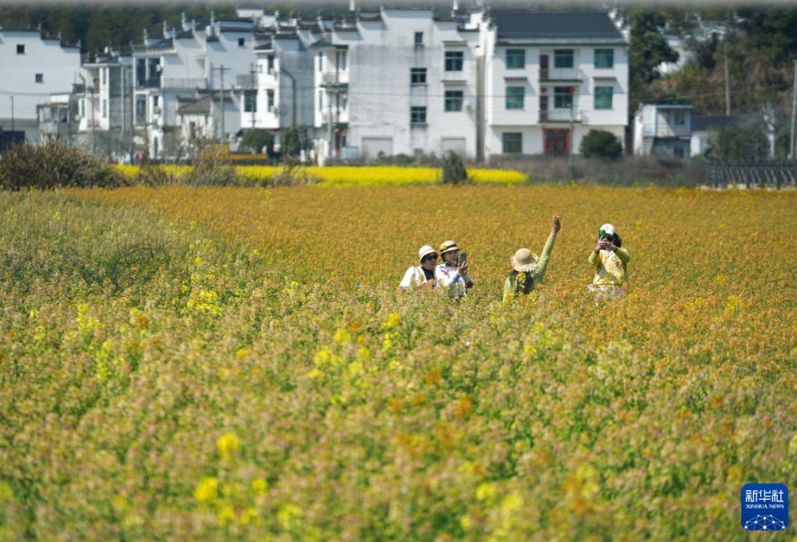 遊客在江西省婺源縣賦春鎮嚴田村觀賞彩色油菜花。(新華社資料圖)