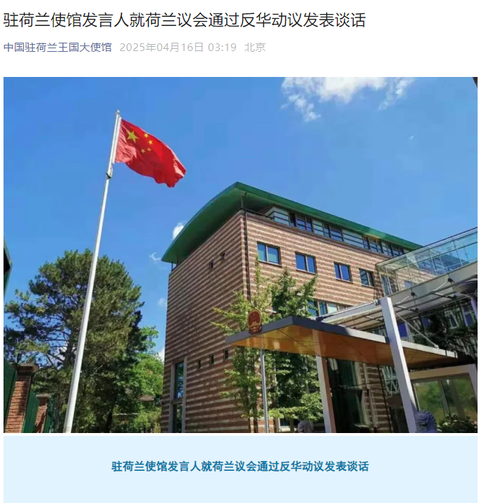 香港中通社4月16日電 荷蘭議會二院當地時間15日通過多項反華動議,中國駐荷蘭使館發言人16日對此表示堅決反對,予以強烈譴責。