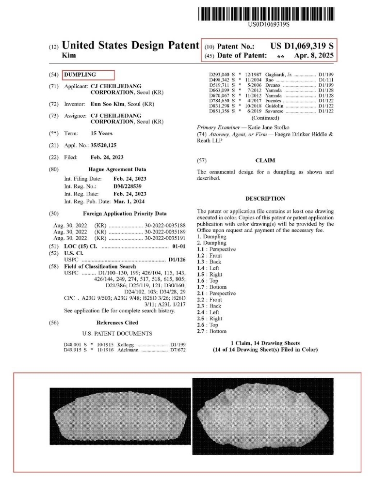 專利申請文件。(圖源:封面新聞) 美國專利商標局官網顯示,近日,韓國CJ第一製糖股份有限公司(下稱“CJ公司”)在美國註冊的餃子外觀專利,獲準通過。文件顯示,該專利申請日期為2023年2月24日,獲批日期則為2025年4月8日,專利的保護期限為15年。 據悉,該韓國企業共上傳了14張各個角度的餃子照片。核心特徵描述為“14-16道順時針螺旋褶皺、底部平坦、頂部隆起的半圓形麵皮”,並附上了毫米級精度的3D建模圖。 “這不是中國的傳統美食嗎?”消息傳出後,中國網友們直呼“離譜”,紛紛表示這是“文化挪用”,是韓國企業用法律手段將中國的傳統文化據為己有。不少人擔憂,“14道褶的餃子不能包了?”“在美國開中餐館賣餃子算不算侵權?” 對此,律師表示,若中國在美國銷售的餃子完全符合上述特徵,可能觸發美國關於專利權的規定。 還有專業人士表示,CJ公司的餃子外觀專利申請,想藉此行銷的成分更大。有實力的商家可以向美國專利商標局提出專利無效,企業如果不想陷入侵權糾紛,最好還是規避使用這類形狀。 值得注意的是,從公示文件中可以看到,該韓企在美國申請餃子的外觀專利時,是引用了韓國的專利優先權,即先在自己國家申請專利,再到國外申請專利。該專業人士指出,“CJ公司分別在日本、韓國、美國及世界產權組織都註冊了名為‘餃子’的外觀專利。” 公開信息顯示,CJ公司是韓國的一家食品和生物企業,旗下有一款餃子品牌bibigo(必品閣),在中國電商平台和線下商超均有銷售。 餃子,又稱為“扁食”“餃耳”“角子”,是中國傳統美食。據考證,餃子的起源可追溯至春秋時期的滕國地區(今山東省滕州市境內),考古學家在該地區的墓葬中發現了可能是最早的餃子實物證據。