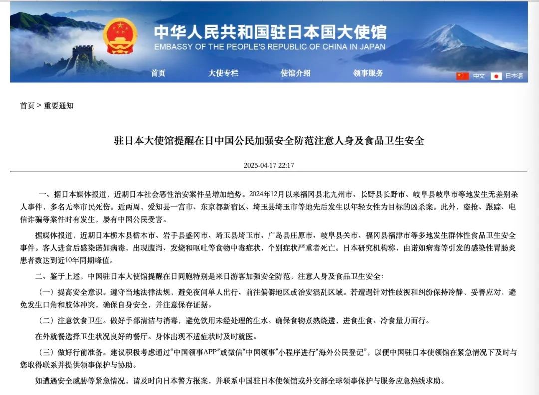 中國駐日本大使館官網截圖 據日本媒體報道,近期日本社會惡性治安案件呈增加趨勢。2024年12月以來福岡縣北九州市、長野縣長野市、岐阜縣岐阜市等地發生無差別殺人事件,多名無辜市民死傷。近兩周,愛知縣一宮市、東京都新宿區、埼玉縣埼玉市等地先後發生以年輕女性為目標的凶殺案。此外,盜搶、跟蹤、電信詐騙等案件時有發生,屢有中國公民受害。 據媒體報道,近期日本栃木縣栃木市、岩手縣盛岡市、埼玉縣埼玉市、廣島縣莊原市、岐阜縣關市、福岡縣福津市等多地發生群體性食品衛生安全事件。客人進食後感染諾如病毒,出現腹瀉、發燒和嘔吐等食物中毒症狀,個別症狀嚴重者死亡。日本研究機構稱,由諾如病毒等引發的感染性胃腸炎患者數達到近10年同期峰值。 鑒於上述,中國駐日本大使館發文提醒在日同胞及來日遊客加強安全防範,注意人身及食品衛生安全。(完)