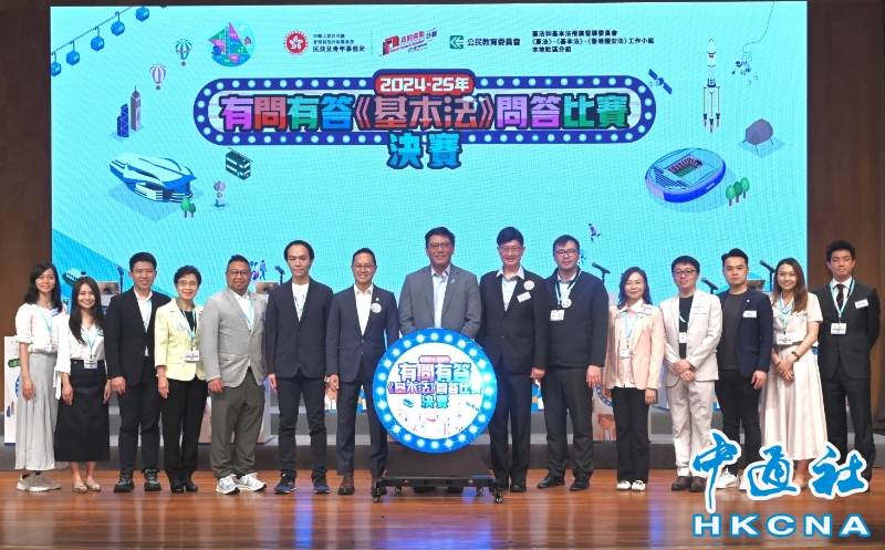 •   4月19日,香港民政及青年事務局副局長梁宏正(中)、公民教育委員會主席兼憲法和基本法推廣督導委員會《憲法》、《基本法》、《香港國安法》工作小組本地社區分組召集人蔡德昇(左七)和公民教育委員會2024-25年度國民教育小組召集人兼憲法和基本法推廣督導委員會委員湯修齊(右七)在“有問有答《基本法》問答比賽”決賽暨頒獎禮與其他嘉賓合照。 香港中通社圖片
