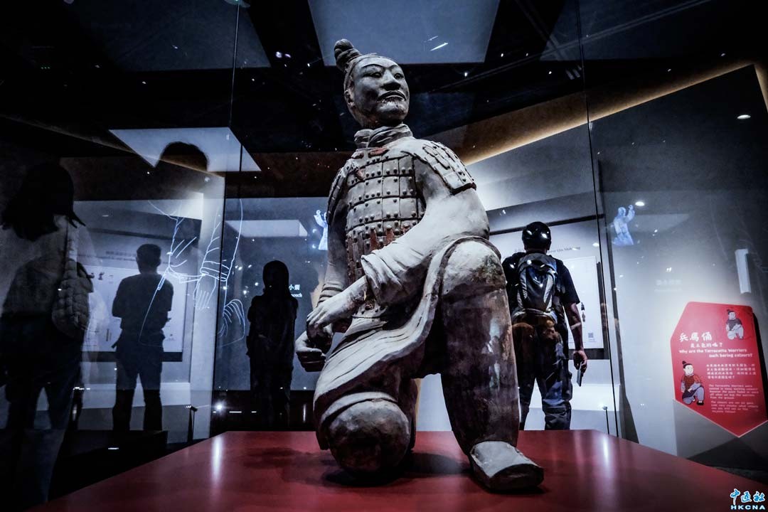 “香港賽馬會呈獻系列:天下一統—陝西秦漢文明展”4月16日起在香港歷史博物館展出。展覽介紹秦漢時期的政治、經濟、文化、科技以及中外交通等發展,呈獻逾100套精選藏品,分別來自秦始皇帝陵博物院、漢景帝陽陵博物院及陝西省考古研究院(陝西考古博物館),如舉世聞名的秦始皇兵馬俑、秦漢兩代都城的建築磚瓦、漢景帝地下兵團及琳瑯滿目的牲畜群像。展覽亦介紹香港在秦漢時期的發展,展出逾20套在香港出土的文物。(香港中通社記者 許其皓攝)