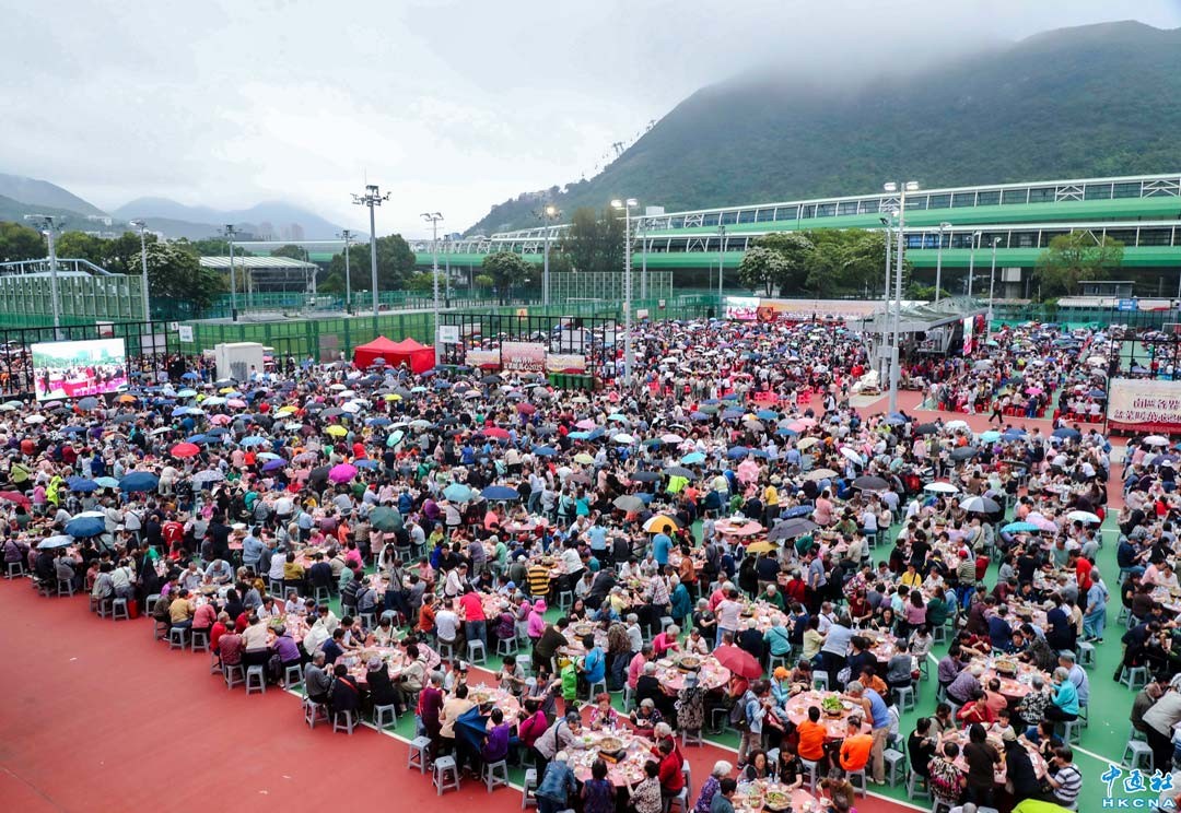 4月18日下午,香港民政事務總署、香港汕頭社團總會與南區各界合辦“南區各界盆菜暖萬心2025”在黃竹坑遊樂場足球場舉行。活動旨在透過舉辦盆菜宴,供南區內的長者及弱勢社群一同享用,讓他們感受社區的關愛。現場近千桌盆菜,規模盛大,英歌舞在會場穿梭表演,場面熱鬧。 (香港中通社記者 洪少葵攝)