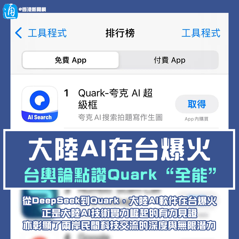 香港新聞網4月23日電 繼Deepseek之後,中國大陸又一AI(人工智能)軟件在台灣爆火!台輿論指出,台當局與其花費百億新台幣研發點面線APP,不如與大陸交流學習,開發民眾真正需要的APP。 大陸AI(人工智能)應用Quark(夸克)近期在台灣市場創下佳績,不僅持續霸佔台灣地區App Store(蘋果應用商店)工具類別排行榜第1名,更衝上App Store免費榜第2名,成為台灣用戶新寵。 不少台灣用戶在社交媒體分享,認為Quark深度思考功能在旅遊出行、健康諮詢、投資置業、法律諮詢等諸多方面都能給出優質回答供參考,幫助提升決策效率,是繼DeepSeek之後的又一大陸AI“神器”。 有台灣學生家長表示,Quark的拍照搜題功能非常實用,可以像老師一樣針對性解析問題答案,大幅減輕家長輔導作業的壓力。 “大陸一直在悶聲搞科技,黑馬一批接著一批。”一位台灣女生在社交媒體上大讚Quark好用, “平時遇到需要規劃行動的事情,我就會全部丟給Quark。特別是我要安排行程、寫文案、找一些寶藏美食店的時候,它根本就是我的工作兼生活助理。” 該台灣女生直言Quark在台受熱捧,不少朋友甚至詢問她如何辦理大陸手機號,用來登錄Quark體驗更全的功能。她還希望Quark能夠早日推出繁體字版本和閩南語的提問功能,“因為我的台灣家人也很想試試看。” “最厲害的是,它真的像個八邊形戰士,問什麼做什麼都可以!”台網紅“寒國人”日前也在YouTube頻道大讚Quark“全能”。他舉例稱,比如老闆讓你寫一份行業報告,你需要查資料、找案例、看翻譯、做總結,甚至最後還要做份PPT,這些事情Quark全能搞定。 “寒國人”還補充稱,Quark採用阿里巴巴自研的大模型,不靠別人、只靠自己,不僅霸榜台灣地區App Store,還是全球AI排行榜第6名。