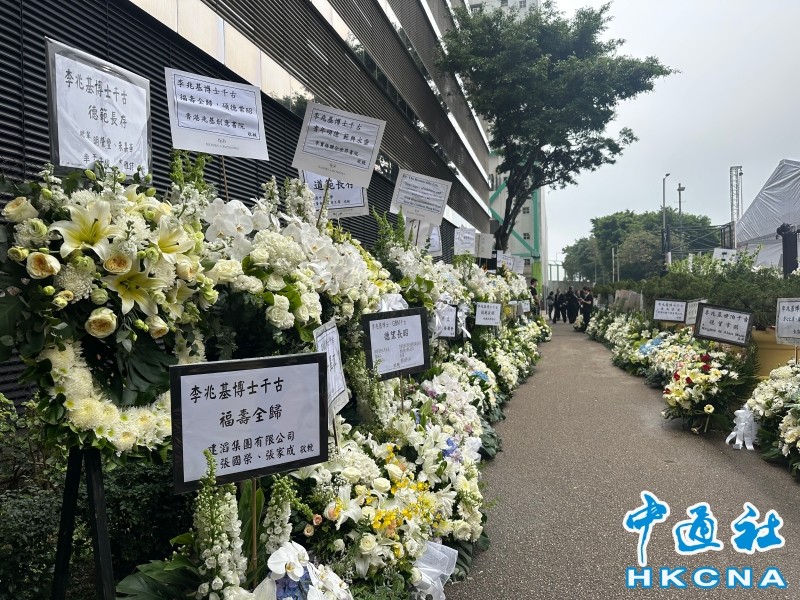 圖為現場大批致哀花圈。香港中通社圖片 當天下午,天氣微涼,位於北角的香港殯儀館內外擺滿了白色花圈,門口高掛寫著“李府”的白燈籠,靈堂設置大型佛壇,現場看到前行政長官曾蔭權、多名香港特區政府官員、立法會議員前來致祭,本地商界知名人士也陸續到場。 當天中午,殯儀館外已有大批記者在場拍攝。李兆基長子、恒地聯席主席李家傑,以及幼子李家誠徐子淇夫婦從殯儀館步出,面向傳媒鏡頭表示“辛苦大家”,神情肅穆。 殯儀館外,工作人員持續不斷搬來花籃,本地大型企業、香港立法會議員、高校校長等都送來白色鮮花悼念,現場也有不少來自李兆基故鄉廣東順德商界、社團的花牌。在靠近殯儀館入口的一幅牆上,數十個花牌都來自李兆基捐贈的中學、小學,還有聯合國兒童基金會送來的花牌,這些都是李兆基生前灑下的慈善種子。 為了便利公眾致祭,殯儀館對面的公眾球場設置了大型帳篷悼念區,簡單佈置祭壇,薰衣草和白色鮮花團團圍住李兆基的遺像,鋼琴曲悠揚,現場電視屏幕播放李兆基生前與家人的合影,每一張都是露齒慈祥笑對鏡頭。 公眾人士祭悼後,都在現場派發的蓮花形狀便簽紙上寫下心意;“親愛的四叔,一路走好”“李博士,再見了!”“老闆,感謝多年來的照顧”⋯⋯蓮花池填滿了各界的悼詞,旁邊的牆上貼著包括香港、北京、上海等高校發來的弔唁信。 “永遠懷念李兆基博士”,現場領取的小冊子封面寫著這一行字,翻開後是“上善若水 自然無為”的書法字,31頁的小冊子,以多幅照片和簡單文字講述了“四叔”一生的故事。 他是家裡排行第四的兒子,他帶著1000元港幣來到香港參與創辦了新鴻基企業,他曾經是亞洲首富;他熱心公益捐資興建了北京奧運場館水立方,他尤其重視教育興辦學校資助學子;他長期看好香港,曾許諾恆生指數攀上三萬點就捐十億港幣做慈善並在2018年兌現承諾。 “授人以魚,不如授人以漁”,小冊子最後一頁寫著這麼一句話,配圖是李兆基在木製漁船上釣起一隻大魚開心大笑,順德人“四叔”以其一生的慈善事業踐行了這句話。 據李兆基的家屬早前公佈,28日上午將舉行團體公祭及大殮出殯儀式。隨後,其骨灰將歸葬於其家族位於廣東順德大良的飛鵝永久墓園,長眠桑梓。(完) 【編輯:馬華】