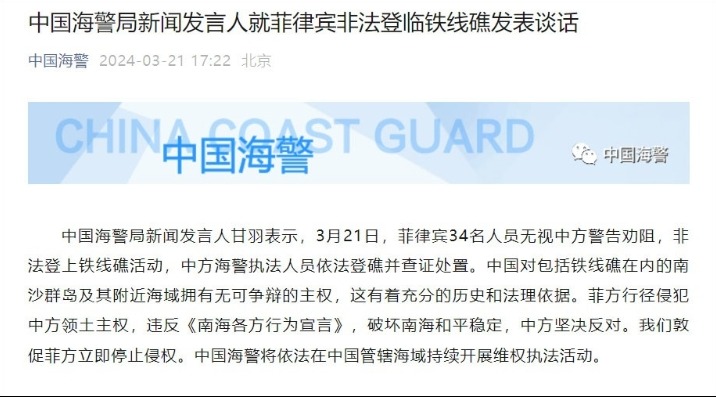2025年1月24日,菲律賓3003號和3004號船未經中國政府允許,侵闖中國南沙群島鐵線礁附近海域,企圖非法登礁。中國海警船依法對菲船攔阻管制、警告驅離。央視新聞報道資料圖 中國海警局新聞發言人劉德軍表示,4月27日,菲律賓6名人員不顧中方警告勸阻,非法登上鐵線礁活動,中國海警執法人員依法登礁并查證處置。 劉德軍表示強調,中國對包括鐵線礁在內的南沙群島及其附近海域擁有無可爭辯的主權。菲方行徑侵犯中方領土主權,違反《南海各方行為宣言》,破壞南海和平穩定。“我們敦促菲方立即停止侵權。中國海警將依法在中國管轄海域持續開展維權執法活動。” 據中國央視軍事早前報道,中國海警4月中旬在鐵線礁實施海上管控,行使主權管轄權。中國海警執法員也在鐵線礁展開五星紅旗宣示主權。(完) 【編輯:豐悅】