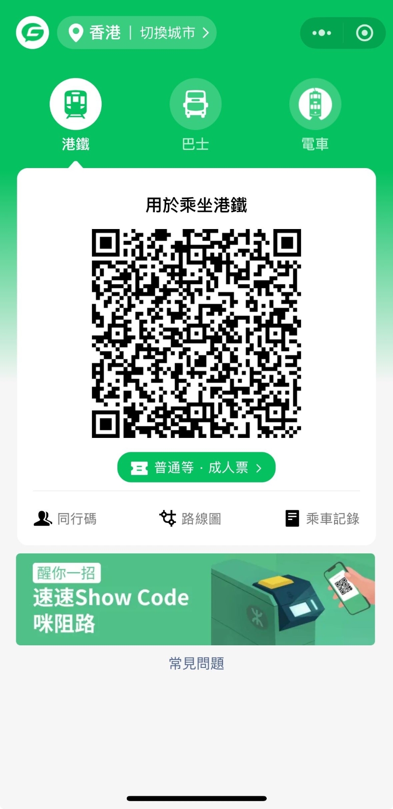 一部手機支援最多三人掃碼 乘搭港鐵出行更具彈性 即日起,在 WeChat/微信“搭車碼”小程序頁面內開通“同行碼”後,即可自動生成最多兩名同行者的港鐵同行碼,掃碼在閘機出入,讓一家大小出行更加暢行無阻。訪港旅客亦可透過這個全新功能為同行而未能使用電子支付的小童或長者掃碼乘車,車費從主用戶 (主碼) 的錢包中扣除,共享升級旅遊體驗。 靈活管理“同行碼” 輕鬆切換票種並可分別查看乘車紀錄 主用戶可透過“管理同行碼”功能,按需要靈活選擇關閉及啟用“同行碼”。主用戶可為同行者選擇乘車票種,包括適用於12歲至64歲人士的成人票,以及適用於3歲至11歲小童及65歲或以上長者的特惠票。同行者的車廂等級 (即普通等/頭等)將預設與主用戶一致。另外,主用戶可在“乘車紀錄”頁面查閱主用戶及同行者的乘車紀錄,有效管理交通支出。 適用於港九新界96個重鐵站 “搭車碼”現已覆蓋港鐵重鐵網絡96個車站(機場快綫車站除外),用戶可透過“同行碼”功能與親友無縫穿梭港島、九龍及新界,進一步享受電子支付的便利。 如何開通WeChat Pay HK“搭車碼”內的“同行碼”功能? 1、先開啟WeChat Pay HK“搭車碼”頁面,點擊左下角的“同行碼”