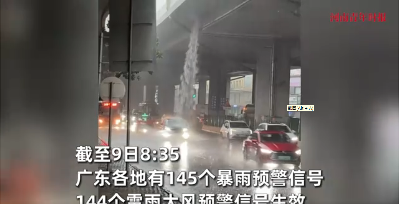 (視頻截圖) 廣州市氣象部門提醒市民避免涉水行車,尤其是積水深度不明的路段,車輛熄火後切勿滯留車內。市民應盡量待雨勢減弱後再出行,並遠離路邊帶電設施。 根據氣象預報,華南地區的強降雨將持續至5月10日,11日起南方大部將迎來3天左右的晴朗天氣。廣州市氣象台預計,10日仍有短時強降水,需繼續防範次生災害風險。 9日上午廣州、深圳、珠海、東莞等地均發布暴雨預警,廣東全省暴雨預警一度超過100個。截至9日14時07分,廣東仍有20個暴雨預警生效,另有17個雷雨大風預警生效中。廣州白雲機場、深圳寶安機場出現不同程度的航班延誤。(完) 【編輯:李彥洲】