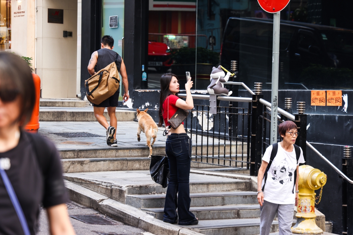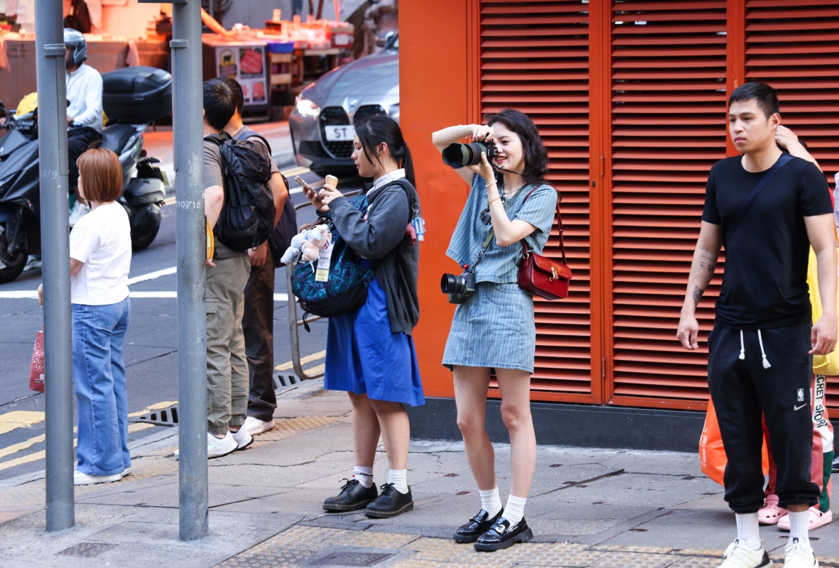 訪港遊客在中環街頭拍照。