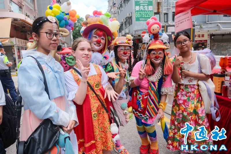 “第六屆油麻地榕樹頭節2025”5月18日在香港油麻地舉行。(香港中通社記者 許其皓攝) 香港中通社圖片 當天,油麻地榕樹頭公園內,有民族歌舞、功夫表演、文創市集、互動攤位遊戲等,吸引大批街坊到場參與。亦有導覽員帶領訪客穿梭油麻地街巷,探索歷史戲院遺跡、消失的老茶樓風貌,介紹城市變遷的故事。 為展現油麻地果欄特色,主辦方還舉辦了“生果(水果)狂奔大賽”,參賽者打扮成各種有趣的角色,如哪吒、超級馬里奧、觀音等,無懼炎熱天氣,推著載滿水果的木頭車飛奔至終點,沿途有不少市民打氣助威,現場氣氛熱烈。