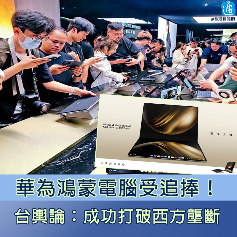 香港新聞網5月21日電 大陸華為首款鴻蒙折疊電腦日前亮相,國產操作系統及新穎外觀引發台灣輿論關注,指出美國封鎖加速了華為研發自己的鴻蒙系統,成功打破西方壟斷。 5月19日,華為舉行新品發布會,推出全球首款鴻蒙筆記本電腦HUAWEIMateBookPro和全球首款鴻蒙折疊電腦HUAWEIMateBookFold非凡大師,標誌著國產操作系統(OS)在個人電腦(PC)領域實現了重大突破。 HUAWEIMateBookFold非凡大師搭載鴻蒙操作系統5+自研麒麟X90芯片, 折疊狀態下為13英寸便攜筆記本,展開後為18英寸巨幕,重量僅1.16kg,比蘋果MacBook Air的1.24kg更輕。短短20小時內,預約購買MateBook Fold的人數便超過10萬人。 華為新款折疊電腦亦引發台灣輿論關注。台退將栗正傑在一檔政論節目中指出,美國為了掐住華為的脖子,Windows等操作系統都拒絕給華為使用,反而逼著華為研發出自己的鴻蒙系統,成功打破了西方長達數十年的壟斷!