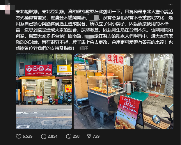 香港新聞網5月28日電 在台灣開小吃店的大陸男子因聽不懂閩南語,擔心造成溝通誤會,遂在店門口設立了一塊告示牌,未料竟被台派網暴? 近日,一名來自大陸東北的男子在台灣嘉義開炸雞店,因不懂閩南語,便在告示牌上寫下“老闆是東北人,請不要講閩南語”等字樣,結果遭到台派人士出征,指他不尊重當地文化,甚至要求他“滾回大陸”。 引發爭議後,李姓老闆在社交媒體Threads發文,解釋他沒有不尊重閩南語,只是剛來台灣生活沒多久,還在學習中,於是立一個告示牌以便更好服務顧客。“讓大家這麼激烈的討論,實在很對不起,牌子馬上會去更改,會用更可愛帶有善意的表達,也感謝各位對我們的支持及指教”。 李姓老闆透露他今年35歲,原先在大陸從事中醫相關行業,2023年與台灣妻子結婚,因體恤妻子決定定居台灣,但因兩邊證件不通,所以選擇經營一間炸物店討生活。 對於有些台派質疑其假結婚,老闆說從決定來台灣後他就開始準備各種資料,花了約半年才真正搭上飛機,降落於松山機場馬上就被相關人員帶去面談,確認與妻子的關係、大陸的家庭狀況等,花了5個小時才放他離開,“可想而知有多麼困難,所以那些說什麼假結婚的,我只是一個單純來台灣生活的大陸東北人,想在這裡靠自己能力生存下去、熱愛和平的普通人”。 但其解釋仍遭部分台派人士持續聲討,李老闆坦言擔憂會波及家人,因此宣布27日起停業休息,開業時間另行通知,重新營業後會推出東北特色料理如東北鍋包肉,東北小串之類,也再度對引發輿論風波致歉。