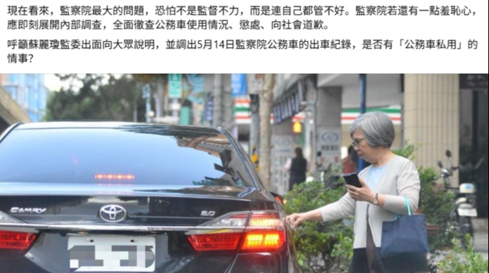 香港中通社5月29日電(香港中通社記者 鄭竣凱)台灣監察機構多名監委曝出公車私用醜聞,有人運送寵物,也有人接送親友、看牙醫,曝光醜聞的中國國民黨民代指,負責整飭官箴的監察機構,正養著一支“特權車隊”。 繼台監察機構秘書長李俊俋被曝光用公務車送寵物去做美容後,又有數名監察委員被曝有公車私用的行徑,包括蘇姓監委乘公車處理私事並前往牙醫診所,林姓監委動用公車接送親友往返機場。 台監察機構正副首長公務車數量達29輛,遠遠超出當局其它部門配車數量,國民黨立委羅智強質疑,監察機構淪為“肥貓單位”,部分監委公車私用非偶然為之,而是已成常態行為,才會被民眾抓拍並檢舉。 隨著越來越多的監委公車私用被曝光,原本護航“勿上綱上線”的民進黨立委也看不下去,承認醜聞已嚴重打擊監察機構的公信力以及形象。