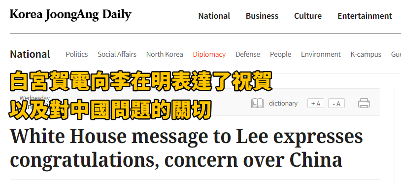 韓國《中央日報》評論稱,李在明勝選後,白宮在賀電中罕見地提及中國。在美國總統特朗普首個任期中,同為共同民主黨出身的文在寅當選韓國總統後,美國的賀電并未提及包括中國在內的其他國家。此次賀電針對中國的尖銳措辭或反映出特朗普2.0時代對華愈發強硬的立場。 美國釋放的這一信息,既可以解讀為塑造韓國新政府外交姿態的先發制人之舉,也可以解讀為呼籲韓國在更廣泛的地緣政治挑戰面前與美國保持團結。