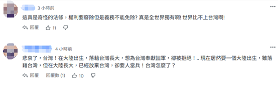 在相關消息下方評論區,不少網友表示要求放棄台籍人士服兵役的法條實在“奇怪”,若只廢除權利但不免除義務,那真可謂“全世界獨有”。