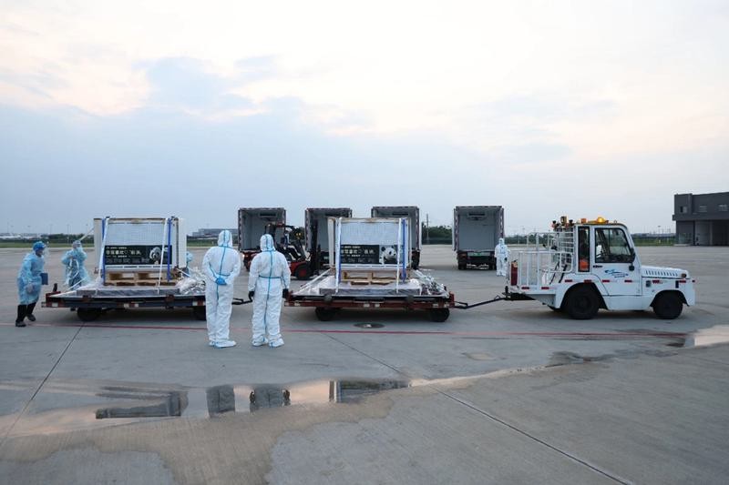 6月28日,搭載大熊貓“良浜”“結浜”“彩浜”“楓浜”的飛機抵達成都雙流國際機場。新華社照片