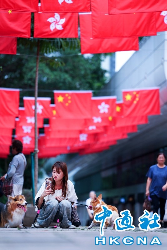 7月1日,香港回歸祖國二十八周年,香港尖沙咀柏麗大道掛滿了中華人民共和國國旗和香港特區區旗,鮮艷的旗海格外醒目,街頭喜氣洋洋。圖為市民在旗海下為寵物拍照留念。(香港中通社記者 徐文峰攝) 香港中通社圖片