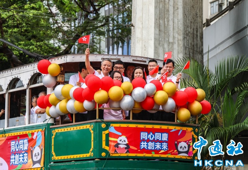 7月1日,慶祝香港特區成立28周年暨中企服務進社區電車免費乘車日啟動禮在西環屈地街電車總廠舉辦,香港民政及青年事務局局長麥美娟等人主禮啟動儀式。為慶祝香港回歸祖國28周年暨香港特區成立紀念日,7月1日至3日電車可免費乘搭。(香港中通社記者 曹文毓攝) 香港中通社圖片