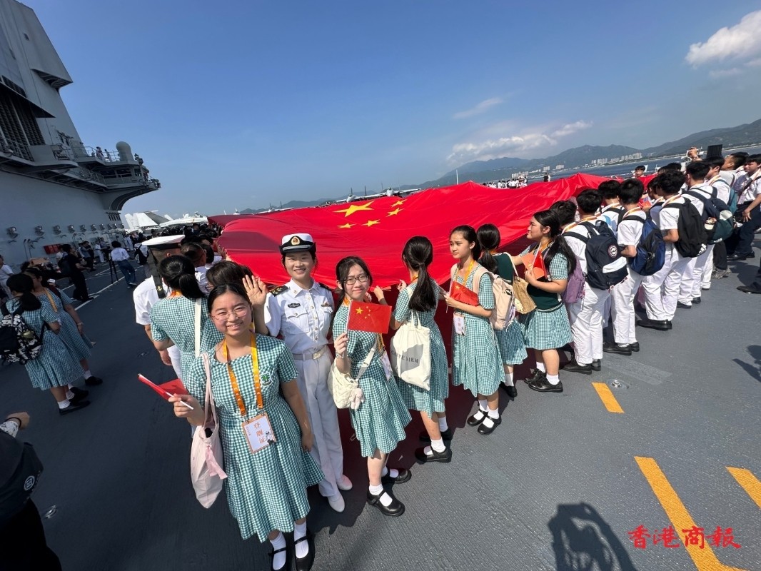 一眾師生在甲板上合力拉起一幅巨型的國旗。來源:香港商報 7月4日,山東艦編隊安排數間香港中學的老師和學生登艦參觀,并與官兵交流。一眾師生在甲板上合力拉起一幅巨型的國旗,軍艦儀仗隊奏樂歡迎。有學生形容自己大開眼界,現場不時傳來孩子們驚喜的“哇~~~”聲。 有中學生形容,能够登上航空母艦參觀是完成夢想。有中學生說,以往這些軍事設施只能在書本和圖片上看得到,今次能够親身體驗感到很震撼,心情激動興奮,登艦前事先搜集了一些戰艦資料,印象最深刻是可以親眼見到戰機,同時感受到官兵的活力和親和力。 香港眾多政商界人士登艦參觀後,紛紛盛讚祖國繁榮強盛,香港共享國家強盛高光時刻,與有榮焉。 特區政府政務司副司長卓永興在社交專頁發文指,山東艦編隊選擇在香港開放予公眾上艦參觀,一睹國家軍事建設的發展及軍事實力,機會極為寶貴難得,是中央送給香港的一份大禮,充分彰顯對香港的關懷厚愛。香港能共享國家強盛的高光時刻,實在與有榮焉。 全國人大常委會委員李慧瓊撰文指,航母編隊不僅代表了尖端國防科技的突破,更是國家綜合實力的重要象徵。中國海軍的現代化建設是祖國繁榮昌盛的重要基石,體現了國家在科技、經濟和國防領域的全面進步。通過這類活動,公眾能夠切身感受到祖國發展的艱辛歷程與輝煌成就,進一步激發民族自豪感,增強對實現中華民族偉大復興的信心與認同感。 7月5日 “看!這長長的就是飛行甲板,殲-15就在這里起飛!”“百分百國產的!比遼寧艦更先進!”“山東艦來港的第一天我就在山上拍,坐船近距離觀賞又有不一樣的感覺!” 由航空母艦山東艦,導彈驅逐艦延安艦、湛江艦,導彈護衛艦運城艦組成的海軍艦艇編隊3日至7日訪港,掀起一股“軍艦熱”。 記者5日早上在中環碼頭看到,大批幸運的軍艦迷預約了首班擺渡船,早上8時前已到達碼頭準備安檢,乘坐駐港部隊安排的接駁船出海登艦。 沒有搶到票的人,則想方設法一睹航母英姿。香港旅遊界立法會議員姚柏良聯同香港旅遊業議會組織了水上遊活動,包下四層高觀光遊船,邀請260名業界同仁和市民“追艦”。香港水上的士更開設“觀艦專線”,船票迅速售罄,周末加開六班船,帶市民前往最近觀賞點觀艦。 7月6日