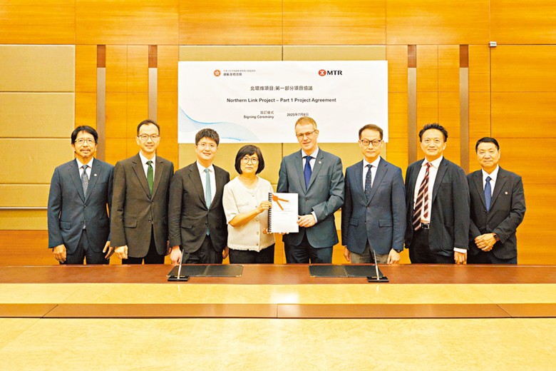圖為香港特區政府相關部門與港鐵簽訂項目協議後合照。香港特區政府新聞處資料圖 第一部分項目造價約314億元 特區政府與港鐵已同意北環線採用“兩部分”模式推進。第一部分將涵蓋北環線主線的部分設計及建造,以及北環線支線之詳細規劃及設計。第二部分將根據進一步協議涵蓋北環線主線剩餘部分及北環線支線的建造,以及兩線的調試、營運與維修工作等。 特區政府在獨立審核顧問的協助下,已核實港鐵就北環線項目第一部分提供的財務預算,按本月價格計算,項目造價約為314億元。協議預留彈性,容許港鐵夥拍合資企業,並設立機制讓第二部分日後降低成本的措施。 在行政長官會同行政會議批准下,北環線項目第一部分會採用“鐵路加物業”發展模式,特區政府會向港鐵批出錦上路站第二期以及位處粉嶺北、古洞北、新田等合共10幅用地作為住宅及商業用途發展,將來會從按“設有鐵路”基礎評定的十足市值地價中,扣除一筆總數為390.5億元的固定總額,作為對港鐵推展北環線(第一部分)項目的財務資助。港鐵會因應市場情況,適時有序地發展相關的物業項目。 特區政府與港鐵公司昨日(8日)簽訂協議後,會立即啟動較成熟和較迫切的工程,包括北環線主線當中由錦上路站通往牛潭尾車廠連接隧道,以及由新田站通往古洞站的兩段土木及結構工程,同時要求港鐵公司同步進行北環線支線的詳細規劃及設計,包括環境評估和鐵路方案刊憲等法定程序,並爭取以最快速度完成。當相關法定程序完成後,會盡快簽訂第二部分項目協議落實餘下的工程和營運安排。