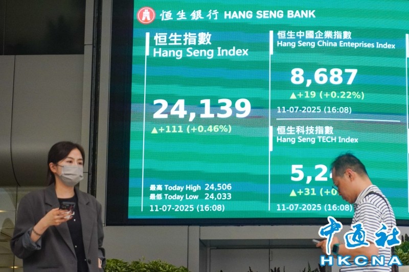 香港中通社7月11日電(記者 徐嘉儀)美股期貨跌幅擴大,港股11日升477點後升幅縮窄,恆生指數收市報24139點,升111點。大市成交額為3239億港元,為3個月多月以來最高。