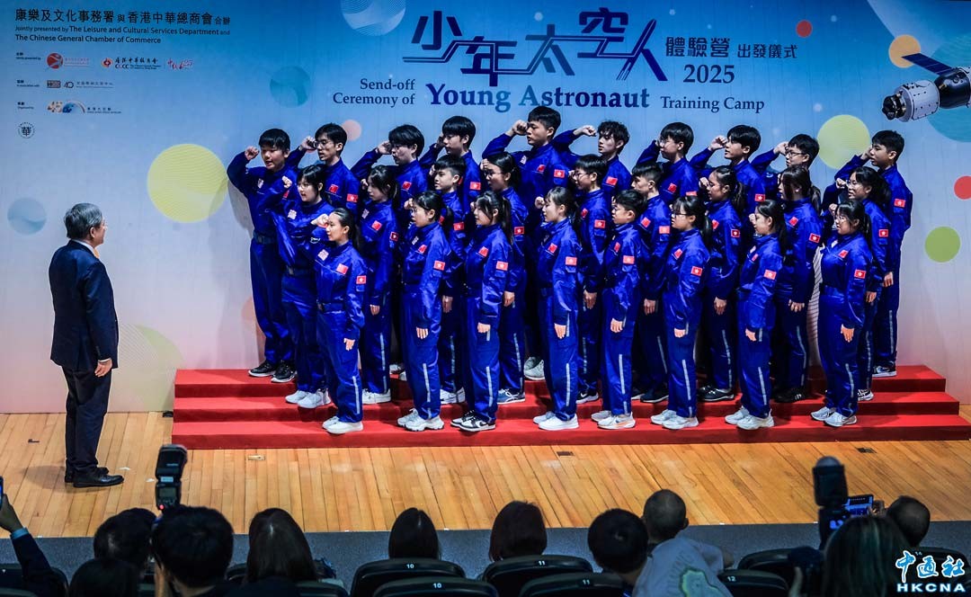 “少年太空人體驗營2025“出發儀式7月22日在香港舉行。由康樂及文化事務署與香港中華總商會合辦的“少年太空人體驗營2025”將於7月25日至8月2日舉行,30名香港中學生將前往北京、酒泉及西安參與為期九日的訓練活動。圖為宣誓儀式。(香港中通社記者 許其皓攝)
