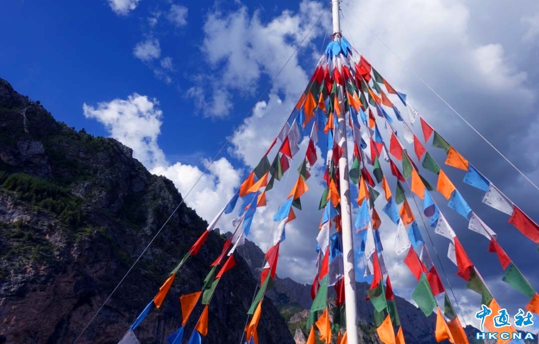 甘肅甘南藏族自治州,近年來以其卓越純粹的自然風光吸引眾多旅客前來探訪。圖為甘南各個草原上常見的經幡。(香港中通社記者 譚暢攝)