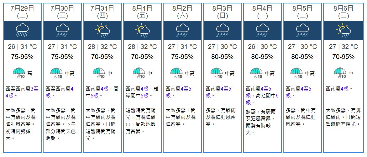 香港地區未來9天天氣預報。香港天文台截圖 此外,在今日(29日)早上5時,熱帶風暴“竹節”草集結在沖繩島之西北偏西約270公里,預料向西北偏西移動,時速約15公里,橫過東海。(完) 【編輯:豐悅】