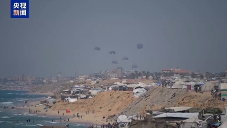 加沙空投物資現場。央視新聞圖 28日,一架飛機向加沙地帶汗尤尼斯的一處流離失所帳篷營地附近空投了物資,但由於數量太少,引發人們的爭搶。面對這樣的混亂局面,加沙民眾強烈呼籲恢復聯合國近東巴勒斯坦難民救濟和工程處(近東救濟工程處)的援助模式。