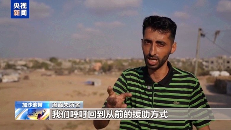 加沙難民接受採訪。央視新聞圖 流離失所者:我們呼籲回到從前的援助方式,應當由聯合國近東救濟工程處負責分發。今天發生的事情太可恥了,人們互相爭奪,我只得到了一升油。
