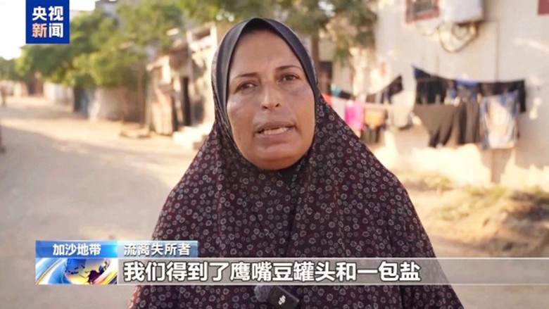 加沙難民接受採訪。央視新聞圖 流離失所者:我們得到了鷹嘴豆罐頭和一包鹽,這就是我得到的,這是錯誤的。聯合國近東救濟工程處本應該負責接收和分發物資,現在這樣,有人能得到,有人得不到,這是不對的。