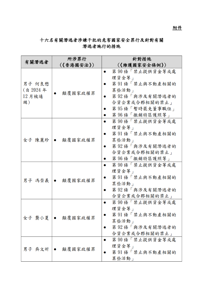 香港新聞網8月4日電 香港特區政府保安局局長於4日行使《維護國家安全條例》(2024年第6號)第89(1)條及第89(4)條所賦予的權力,藉在憲報刊登公告,指明16名因涉嫌在香港特別行政區(特區)境外干犯危害國家安全罪行而被法院發出拘捕令的人,並指明針對這16名有關潛逃者施行的措施。有關詳情列於2025年第43號號外公告及第44號號外公告。 16名被指明的有關潛逃者為男子何良懋、女子陳麗珍、男子馮崇義、女子龔小夏、男子吳文昕、男子曾偉藩、女子錢寶芬、男子夏海俊、男子侯中宇、男子何永友、男子姜嘉偉、男子林千淦、女子吳文君、男子黃振華、男子黃修和及女子張信燕,各人在香港境外一直從事危害國家安全的行為和活動。 警務處國家安全處已於7月25日公布懸紅通緝上述16名潛逃者以及男子袁弓夷、男子霍嘉誌、男子蔡明達。這19名潛逃者在境外籌組、成立或參與一個名為“香港議會”的顛覆組織,涉嫌干犯《中華人民共和國香港特別行政區維護國家安全法》罪行。法院已應警方的申請,就上述19名在逃人士發出拘捕令。 在上述在逃人士當中,保安局局長已於2024年6月和12月先後行使《維護國家安全條例》第89條所賦予的權力,刊憲指明袁弓夷、霍嘉誌及蔡明達為潛逃者,並指明針對他們而施行的措施。 以下三項措施,就全部16名今日被指明的有關潛逃者而適用:“禁止提供資金等或處理資金等”、“禁止與不動產相關的某些活動”及“與涉及有關潛逃者的合資企業或合夥相關的禁止”,而“撤銷特區護照等”亦適用於大部分有關潛逃者。此外,“暫時罷免董事職位”的措施,就個別有關潛逃者而適用。有關潛逃者涉嫌干犯的危害國家安全罪行及針對有關潛逃者而施行的措施詳列於附件。
