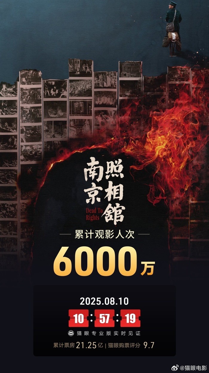 香港新聞網8月10日電 截至2025年8月10日,歷史題材電影《南京照相館》全國觀影人次突破6000萬,總票房達21億元,成為暑期檔最大黑馬。這部由申奧執導、以南京大屠殺為背景的影片,自7月25日上映以來,憑藉其獨特的叙事視角和深刻的歷史還原能力,持續引發全民觀影熱潮。