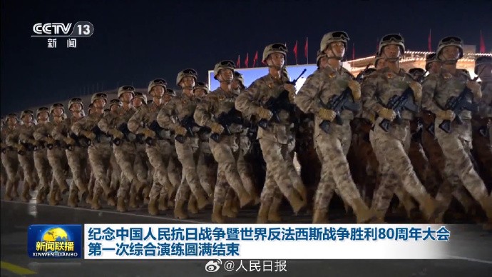 央視截圖 據介紹,第一次綜合演練包括紀念大會儀式等內容,重點磨合了紀念大會全流程各要素的內部銜接,全面檢驗了各方組織保障和指揮運行工作,演練組織有序,達到預期目標。北京市有關方面表示,本次演練活動順利完成,衷心感謝廣大市民群眾的理解支持。 10日晚,中國央視公佈了第一次綜合演練現場視頻,畫面包括中國人民解放軍儀仗隊等。 據悉,紀念中國人民抗日戰爭暨世界反法西斯戰爭勝利80周年大會將於9月3日在北京天安門廣場舉行,包括檢閱部隊。(完) 【編輯:王瑤】
